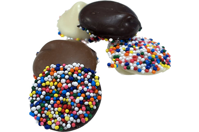 Neat little teardrops of milk, dark, or white chocolate funneled onto tiny multicolored sprinkles. Cannot be found in your local movie theatre..... in multicolored sprinkles.