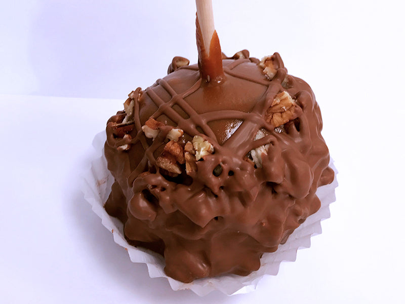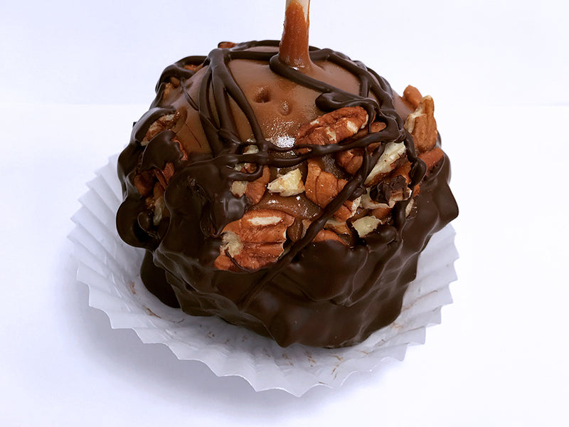 Over the top, just the way we like it: Hallie’s awesome handmade caramel, rolled in chopped pecans, then dipped in chocolate. Choose milk or dark.